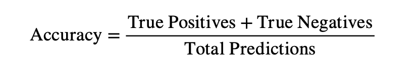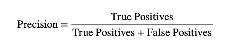 This score gives a general overview of how well the model performs; however, it is important to acknowledge that it can be misleading when the dataset is imbalanced. In the NBI dataset, 66.26% of bridges are fair, 24.31% are good, and only 9.43% are poor, meaning it is possible to achieve a high accuracy score by only identifying fair bridges correctly, and hence it is not used alone. Precision measures the quality of positive predictions, which is defined by the proportion of correct positive predictions in all positive predictions, shown by the formula below: