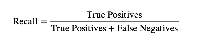 In the condition of budget restrictions, precision would be important, as low recall score would mean predicting good or fair bridges as poor conditioned, causing unnecessary inspections or repairs; therefore, only models with high precision scores are ideal for this task. Recall, on the other hand, shows how complete the positive predictions are, which is how many correctly predicted positives are in all the actual positives, which can be displayed by: