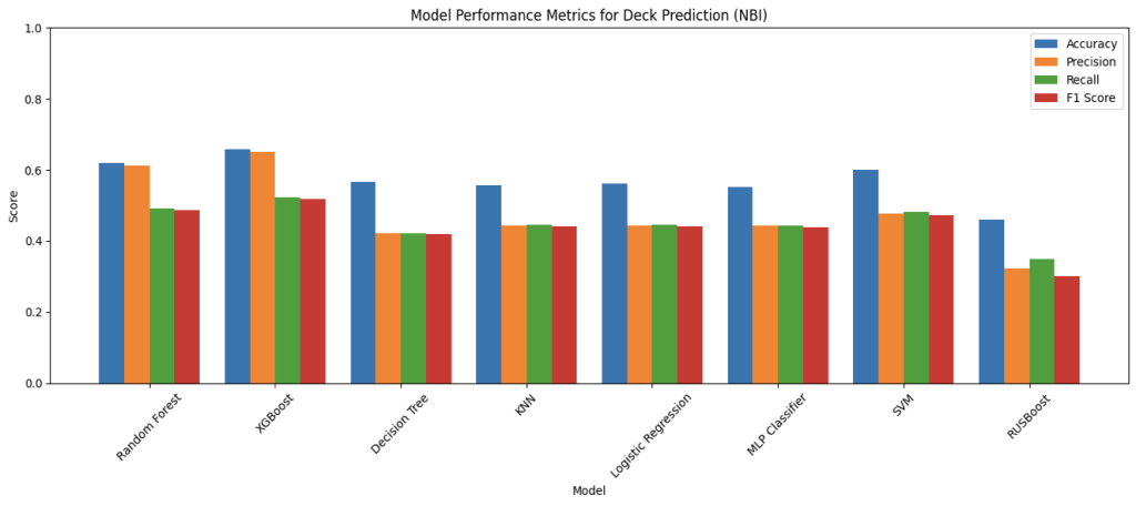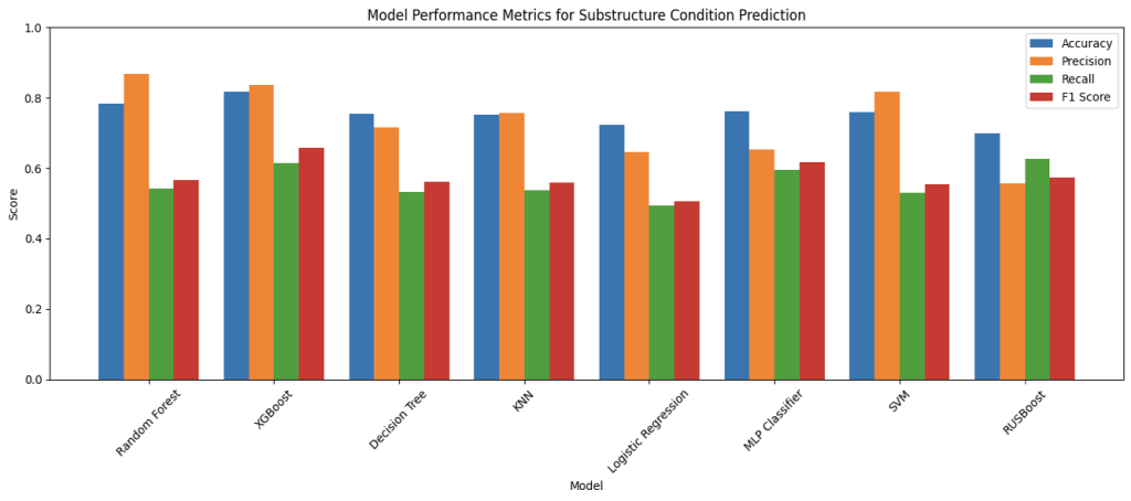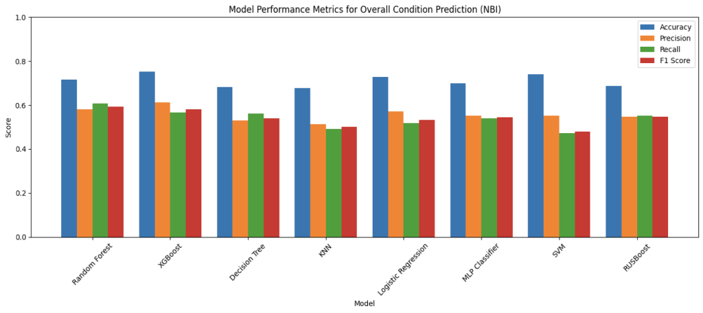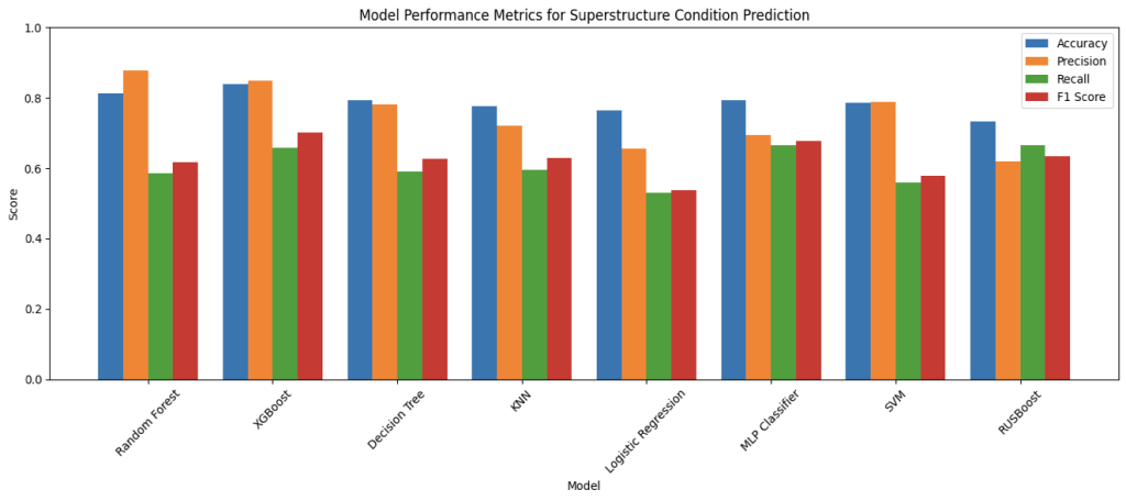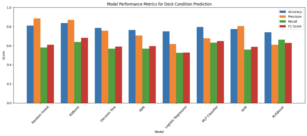 The above four bar charts illustrate the results of the model’s performance on predicting based on the NBI data. For NBI, due to the limited amount of data for each condition rating for every components, the rating of the components are converted into categories of Good, Fair, and Poor with the same ranges as the overall rating. In the metrics for NBI, it can be observed that there is generally a greater gap between accuracy and precision, recall, and F1-score than the scores for MassGIS Data Hub. This is likely caused by the smaller and less balanced data set in the NBI, which after cleaning nulls and rows without data for some predictive fields, there is significantly less data of bridges in the Good category than data in Fair and Poor. And this is possibly a result of having more predictive fields and smaller data size. Looking at the metrics for overall condition predictions, XGBoost achieved the highest score for all metrics except recall, (69.94% for accuracy, 67.66% for precision, and 54.61% for F1-score), which RUSBoost has the highest of 54.23%%. This demonstrates how XGBoost is a strong performer despite the limitation of the dataset, aligning with the previous literature involving XGBoost, and is also consistent with the balance of precision and recall scores, which symbolizes its reliability in potential real world applications. Apart from this, there are also multiple things worth noting about the metrics. In predicting all the components including the overall condition, RUSBoost has maintained a balance score for the four metrics, and an especially high score for recall. This suggests that boosting with undersampling helps the model to handle class imbalances in the NBI, meaning its potential application when balanced and unbiased dataset is unachievable. Furthermore, MLP Classifier, though not the best, shows high consistency throughout the component predictions, with decent F1-score throughout, showing the balance between precision and recall scores, showing MLP Classifier’s potential application to capture the non-linear relationships that’s overlooked by simpler models as a complementary model.