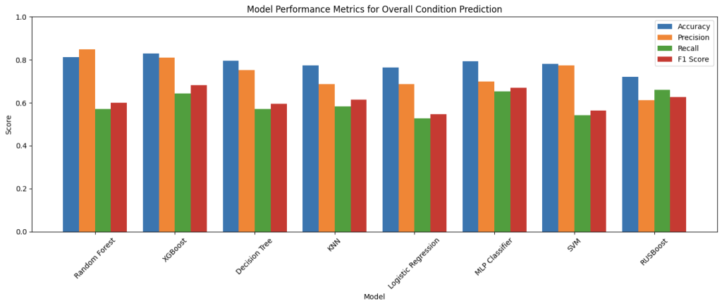 Interpreting the charts above, over the prediction of the bridge decks, superstructures, substructures, and overall condition, Random Forest and XGBoost were the best performing models throughout almost all metrics; specifically, in overall prediction, RF achieved an 81.24% accuracy and XGBoost achieved 82.99% accuracy, and followed by the MLP classifier with 79.29% accuracy. This result follows expectations: firstly, since the target field overallCondition has only three categories (Good, Fair, Poor), it is more likely that the predictions are correct compared to other smaller components; secondly, the two ensemble learning models are inherently good predictors for non-linear interactions between variables and for tabular data, and the neural network MLP classifier is much more complex and stronger than other models tested, making it perform better in condition predictions. However, it is important to acknowledge that accuracy is purely a general measurement of the models’ performance as mentioned earlier, since there are other factors to be considered in the task of bridge condition prediction-specifically recall and precision. It would be more straightforward to analyze the F1-scores as they act as combinations of the two metrics. While Random Forest maintained strong accuracy (81.24%), its F1 score of 59.98% was noticeably lower than those of XGBoost and MLP, indicating a weaker balance of precision and recall, especially in misclassifying minority classes. This therefore illustrates the strong balance precision and recall in XGBoost and MLP, showing how they would be not just accurate, but also reliable and consistent in their predictions. This pattern is especially evident in the prediction of superstructure and substructure where XGBoost achieved F1 scores of 70.27% and 65.70% respectively, and MLP followed with 67.65% and 61.63%, which outperformed other more traditional models in consistency.