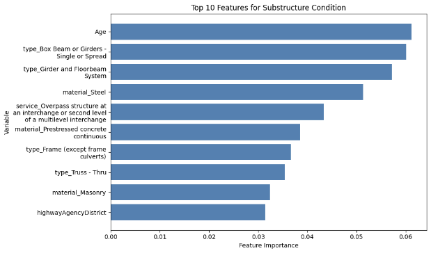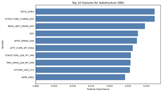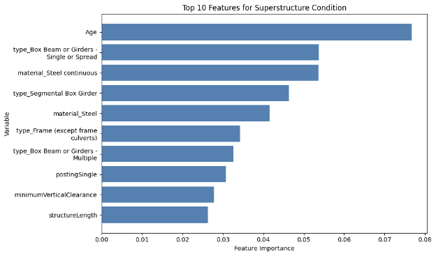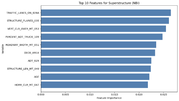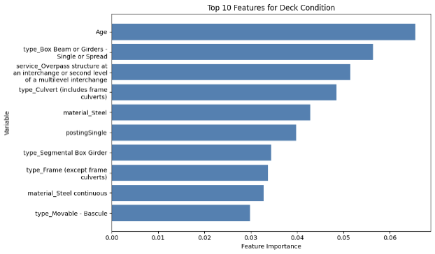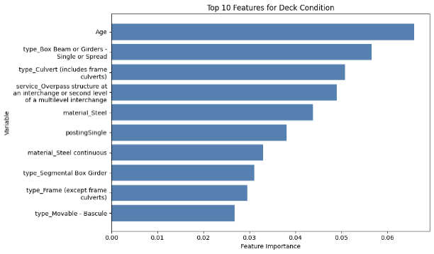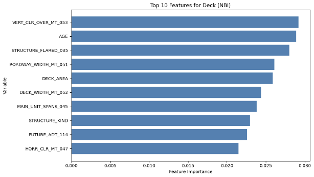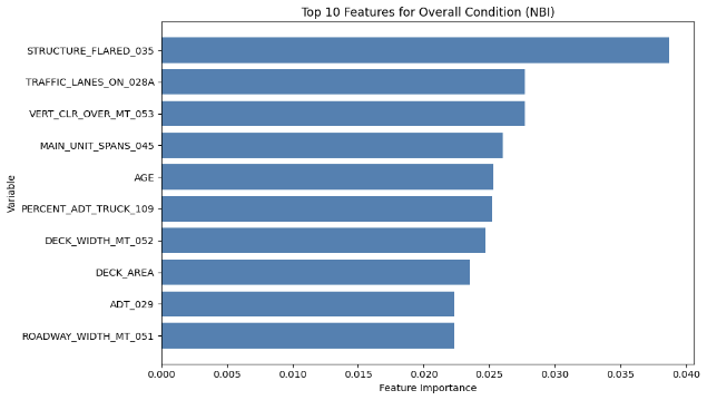 Over the different components, age is one of the most prominent feature in prediction, which is also shown in the results achieved by Mohammadi et al., Nasab et al., and Fard & Fard in their papers. However, the results above also show other important features in prediciton. The top feature in the NBI dataset predictions is STRUCTURE_FLARED_035; a flared bridge would introduce a non-uniform load distribution which could lead to stresses under uneven traffic on top, which could potentially lead to more deterioration than bridges that are not. Also, since flared bridges are also more common in older bridges, it could have an indirect correlation with the poorer conditions of the bridges (Thakkar et al.). Additionally, a major reason could be how flared bridges are generally more difficult to inspect or repair, which could lead to delays in maintenance.