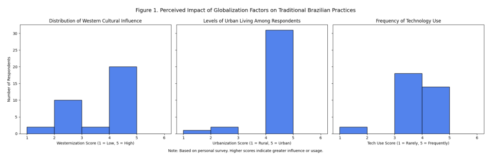 Analysis of the survey findings revealed trends in technology adoption, urbanization, and cultural practice interrelations in Brazilian rural areas. However, the extent of observed cultural change appeared less pronounced than anticipated. This may be a result of the limited sample and may not reflect the full scale of cultural change experienced in more isolated or traditional contexts. The sample, which included respondents already exposed to modern technology and urban influences to varying degrees, may underrepresent the magnitude of cultural shifts. All participants were raised in rural areas but had experienced modernization, either through media exposure or urban migration, potentially diluting the observable impact of cultural change.
