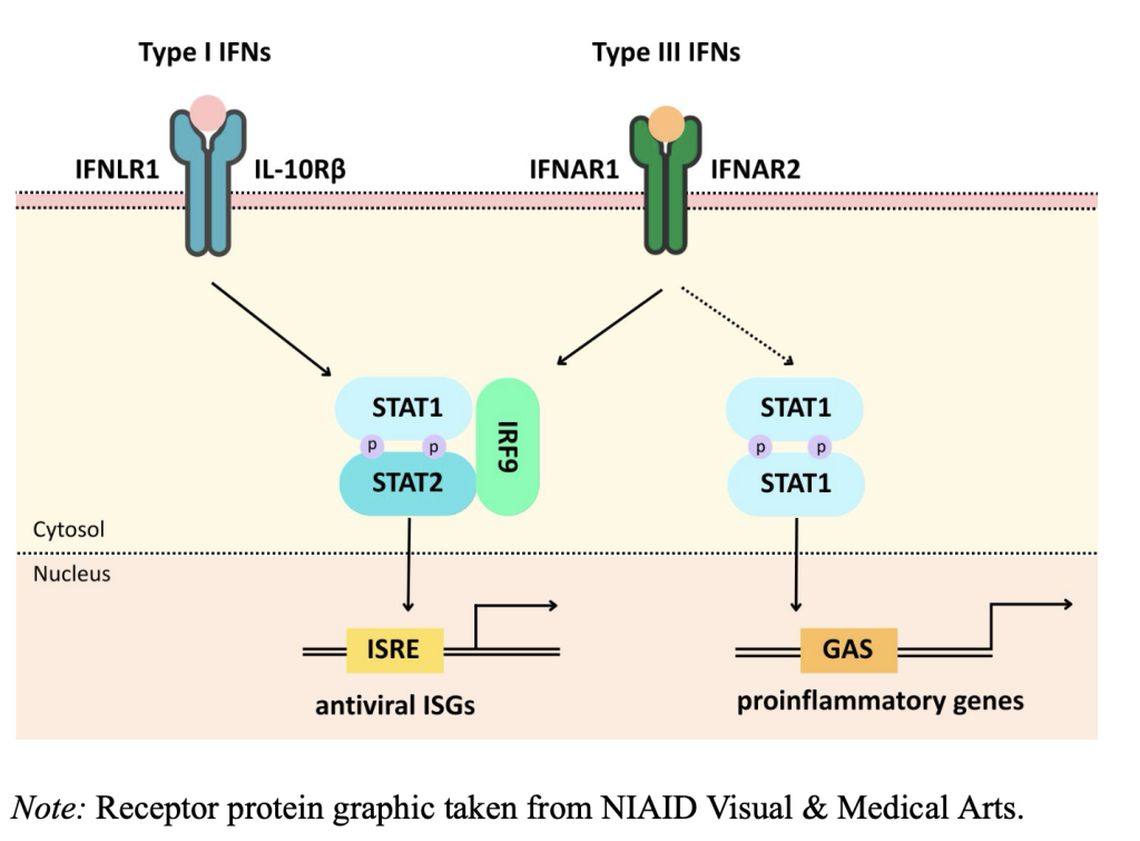 Interferons are vitally important for defending the body against viruses, yet in some infections, they can become problematic. IFNs are a type of cytokine, which are signaling proteins that aid communication between cells during immune responses (Isaacs et al., 1957). IFNs are critical in the innate immune system, which is the first line of non-specific defense against pathogens. The IFN pathway is indispensable for the innate immune system response because IFNs antagonize pathogens, which limits infection and its spread. IFNs essentially are messengers in the immune system, as they alert cells to the presence of a virus and allow them to trigger antiviral defenses (Katze et al., 2002). They are particularly helpful because many IFNs can be found at mucosal surfaces, where disease prevention is key. They help detect viral threats and facilitate the activation and production of antiviral defenses and immune pathways, therefore proving themselves critical in the recovery from viral infections.