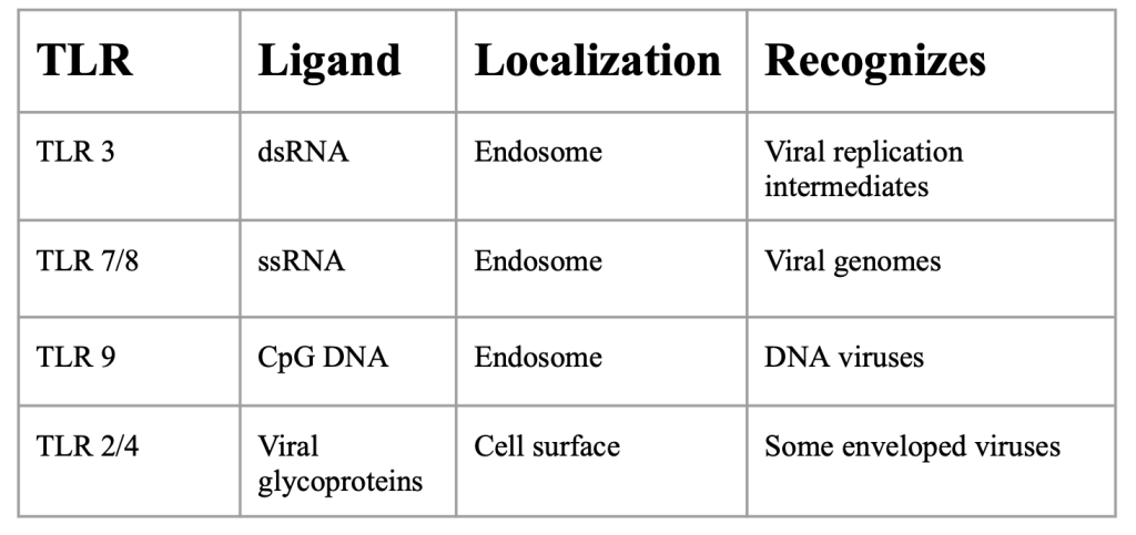 The innate immune system is characterized by its production of inflammatory cytokines that lead to inflammatory cell activation/recruitment. Innate immune cells have pattern recognition receptors (PRRs) which sense pathogens (Uehata et al., 2020). The best characterized PRRs are toll-like receptors (TLRs) which recognize many pathogens. As seen in figure 2, different types of TLRs have different specialties. TLR 3 recognizes double stranded (ds) RNA and viral replication intermediates localized in endosomes. TLR 7/8 recognizes single stranded (ss) RNA and viral genomes localized in endosomes. TLR 9 recognizes CpG DNA and DNA viruses localized in endosomes. TLR 2/4 recognizes viral glycoproteins and some enveloped viruses localized at the cell surface (Kawai et al., 2010). Essentially, Viral nucleic acids are taken up into endosomes, where TLRs detect them.