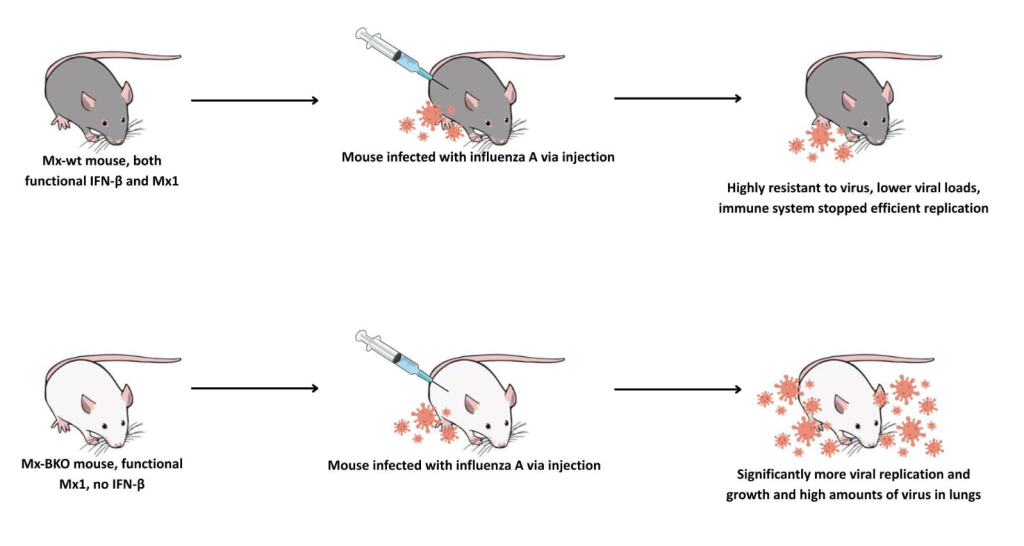 Type I IFNs are known to be critical in acute infections, such as influenza or SARS-CoV-2, but they also are attributed to various negative side effects. Specifically in influenza A, early type I IFN response demonstrates how type I IFNs can have protective antiviral effects but can also contribute to immunopathology (Wu et al., 2020). Immunopathology is adverse effects generated by the immune response (Marshall et al., 2018). It is known that type I IFNs are only effective against influenza in mice if Myxovirus-resistance protein (Mx1), an IFN-induced resistance factor, is present (Abebaw et al., 2024). In a 2007 study conducted by Koerner et al., they generated mutated mice, two of the types being Mx-wild type (wt) and Mx-BKO. Mx-wt mice had both functional IFN-β and Mx1 capabilities, while Mx-BKO mice had functional Mx1 but no IFN-β. Both types of mice were infected with influenza A via injection, as shown in figure 3. Through their studies, they found that IFN-β has a relevant role in early antiviral defense. Mx-BKO mice were significantly more susceptible to influenza A infection compared to Mx-wt mice. These mice allowed lots more viral growth in lab tests, especially when infected through the nose. This was because the 50% lethal dose was 20x lower in Mx-BKO mice compared to Mx-wt mice. In comparison, the Mx-wt mice were highly resistant to the virus and survived high doses of the virus that killed Mx-BKO mice. Their immune system was able to stop the virus from replicating efficiently because they produced IFN-I that induces ISGs that suppress replication in lung epithelial cells. This study illustrated how IFN-β is key in suppressing acute viral replication and without it, the body’s defenses are compromised.