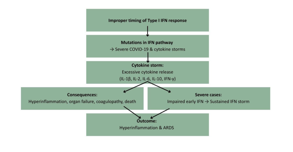 SARS-CoV-2 is the virus that causes coronavirus disease 2019 (COVID-19). Late type I IFN response in SARS-CoV-2 also highlights how improper timing can turn IFNs into contributors of immunopathology. While mutations in the type I IFN pathway have been linked to life threatening symptoms in SARS-CoV-2 infection, they have also been linked to cytokine storms (Kim et al., 2021). A cytokine storm is a hyperinflammatory reaction where the body releases too many cytokines into the blood too quickly (Zanza et al., 2022). It manifests similarly to influenza and can lead to organ failure, coagulopathy and death (Fajgenbaum et al., 2020). Cytokine storms have been determined to be a key pathogenic factor in SARS-CoV-2 infection (King et al., 2021). Various studies have discovered the increased presence of inflammatory cytokines such as IL-1β, IL-2, IL-6, IL-10, and IFN-γ in SARS-CoV-2 patients (Zanza et al., 2022). These increased levels of cytokines are associated with disease severity (Brunet-Ratnasingham et al., 2024). Severely ill COVID-19 patients showed an impaired early IFN response which was followed by a sustained type I IFN storm. This was linked to hyperinflammation and acute respiratory distress syndrome (ARDS) (Hadjadj et al., 2020).