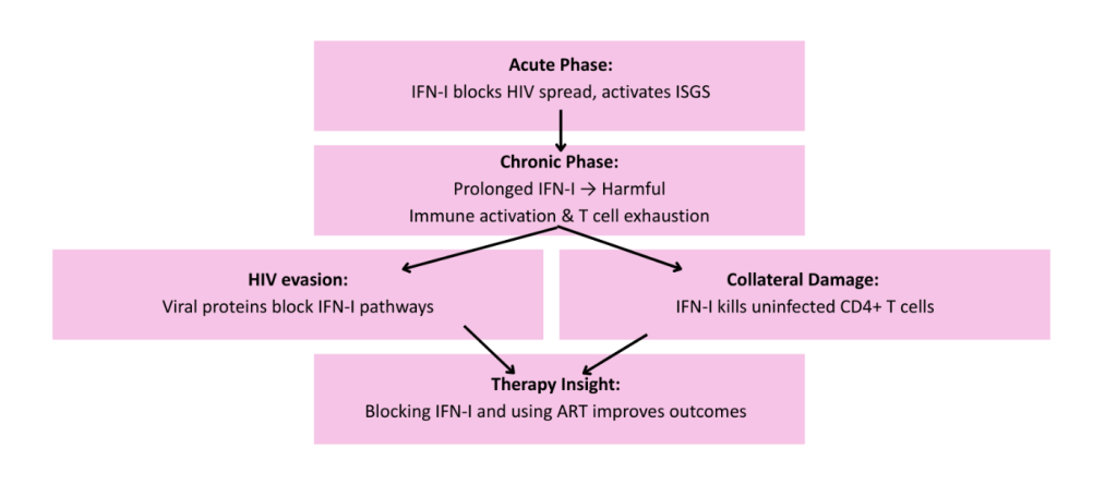 The dual role of IFN-I is also highlighted during HIV infection. Although HIV activates host immune defenses, IFN-I and ISGs are ultimately insufficient to eradicate the virus. In the acute phase of infection, IFN-I hinders HIV-1 spread by stimulating key immune defenses, including ISGs that help contain the virus (Cheng et al., 2017). Despite this though, during chronic HIV infection, prolonged type I IFN exposure has been linked detrimental effects such as desensitization, detrimental hyperimmune activation leading to disease progression, impaired viral control, and upregulation of exhaustion markers on T cells (Scagnolari et al., 2018 and Le Saout et al., 2014). HIV also evades IFN-I’s defense using multiple tactics such as downregulating key signaling factors IRF3, RIG-I, PKR, and MHC-I via viral proteins like Vpr, protease, Tat, and Nef, therefore disrupting IFN-I pathways (Ranganath et al., 2016). In addition, 12 IFN-I can inadvertently induce apoptosis of uninfected CD4⁺ T cells via TRAIL-DR5 signaling, further accelerating immune depletion (Herbeuval et al., 2007). From a therapeutic standpoint, some experimental models suggest that blocking IFN-I signaling during chronic HIV infection in combination with antiretroviral therapy (ART) can diminish immune activation, revitalize CD8⁺ T cell responses, reduce viral reservoirs, and improve viral suppression (Zhen et al., 2016). This highlights the potential benefits of modulating IFN-I dynamics in treated HIV patients. Overall, the role of IFN-I in HIV infection highlights chronic exposure and how timing and duration of IFN responses shape outcome.