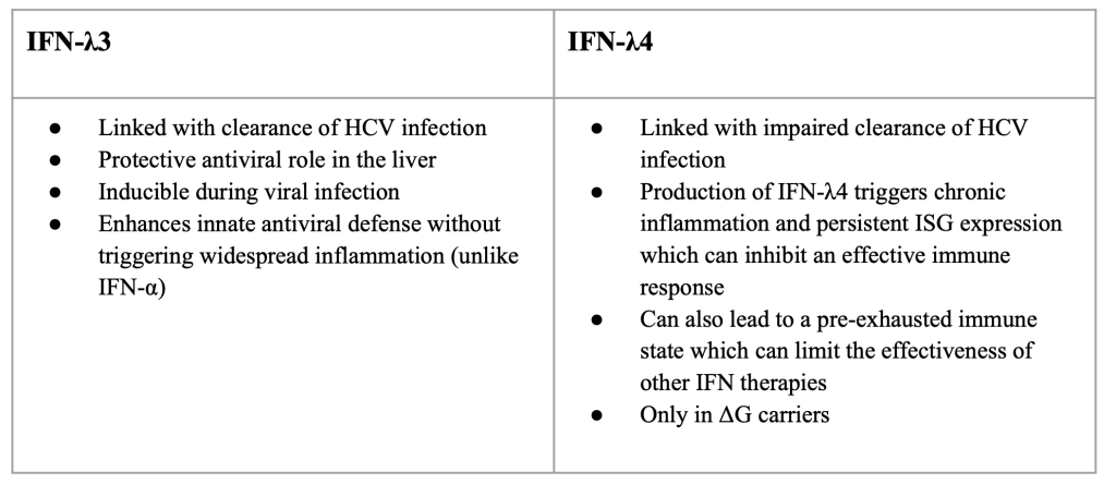 IFN λ-3 and λ-4 in HCV are great examples of the effects of type III IFNs in infections. In HCV infection, IFN-λ3 is linked with clearance of HCV infection as well as a protective antiviral role in the liver (Liu et al., 2015). It is inducible during viral infection and enhances innate antiviral defense without triggering widespread inflammation. IFN λ-4 is linked with impaired clearance of HCV infection (Boisvert et al., 2016). It is known to attenuate HCV-specific T cell responses that leads to a negative impact on cellular immunity (Chen et al., 2021). Production of IFN-λ4 triggers chronic inflammation and persistent ISG expression which can inhibit an effective immune response. It can also lead to a pre-exhausted immune state which can limit the effectiveness of other IFN therapies (Prokunina-Olsson et al., 2013). IFN-λ4 is also only found in ΔG carriers (O’Brien et al., 2014). Some people clear HCV faster than others and this is mostly due to genetic variation. The IFN-λ3 and IFN-λ4 location on chromosome 19 shows single nucleotide polymorphisms (SMPs) linked to HCV outcomes (Ge et al., 2009). One of these SNPs is at Rs12979860 in IFN-λ3. This SNP is highly linked to the spontaneous clearance of HCV without treatment and improved response to therapy. There are three different genotypes individuals may possess that are relevant to this SNP: CC, TT, or CT. Individuals with the CC genotype have higher IFN-λ3 expression which leads to stronger ISG activation and 14 better viral clearance. Those with the CT or TT genotype are less likely to clear the virus naturally or respond well to older treatments (Wu et al., 2015). Rs368234815 in IFN-λ4 is another SNP linked to HCV outcomes. Those with the TT genotype do not produce IFN-λ4 and typically clear the virus more efficiently. Those with the other genotype, ΔG, produce IFN-λ4 which makes it harder to clear the virus. These SNPs illustrate how some IFNs, such as IFN-λ4, can be inherently maladaptive.