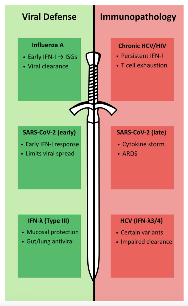Interferon signaling is regarded as one of the immune system’s most powerful antiviral tools, yet its strength makes it a double edged sword. On one side, rapid IFN responses promote viral clearance, activate innate and adaptive immunity, and protect mucosal surfaces. On the other, sustained or dysregulated IFN signaling can promote chronic inflammation, tissue damage, and 15 immune exhaustion, as seen in infections like HCV or SARS-CoV-2. Recognizing the duality of IFN signaling underscores the importance of context, timing, and regulation in immune responses and defense. As research advances, the challenge will be to maintain IFN’s protective qualities in therapies while minimizing their pathological consequences.