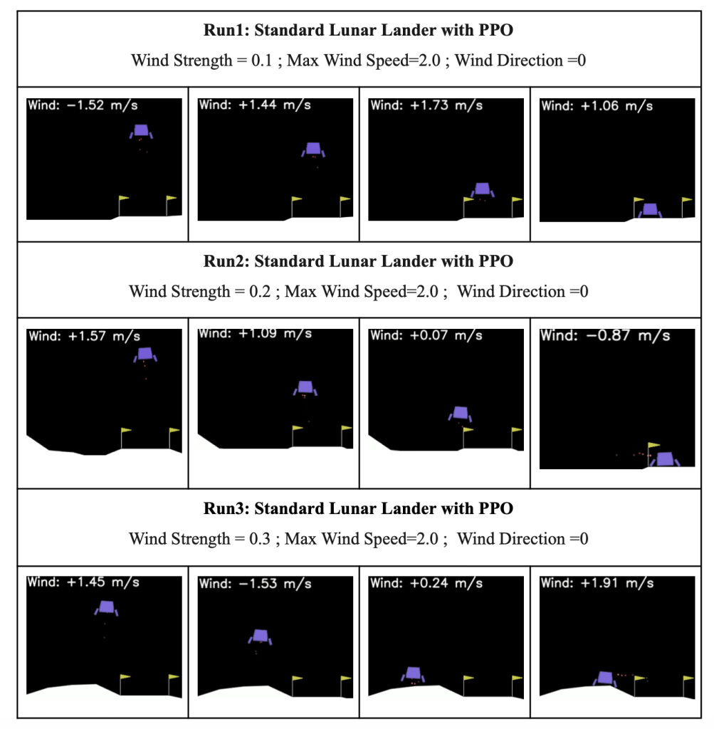 The research methodology presented follows a systematic approach: starting with a baseline PPO implementation achieving consistent performance in standard conditions, then progressively adding complexity through environmental enhancements while maintaining landing precision and safety requirements.