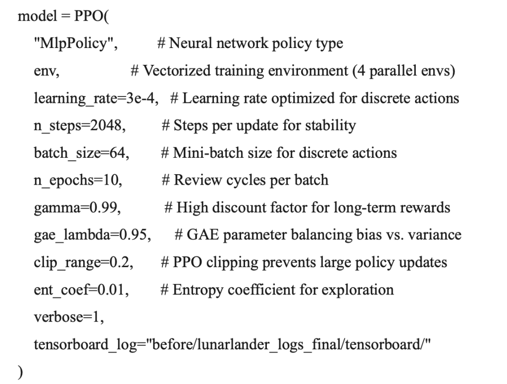 The foundation of the research begins with a robust PPO implementation for the standard LunarLander-v3 environment: