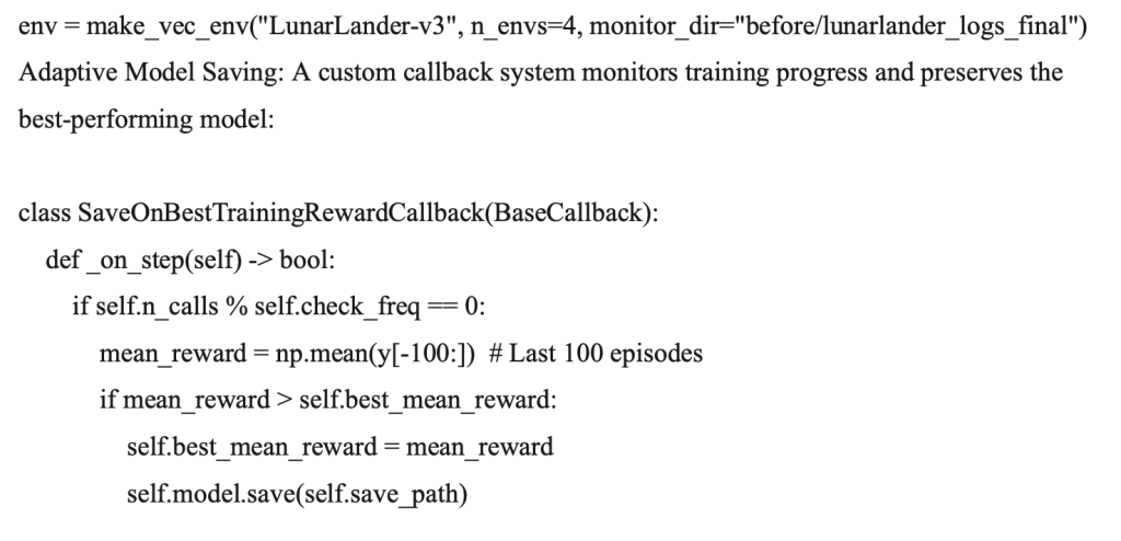 Parallel Environment Training: The implementation utilizes 4 parallel environments to accelerate training and improve sample efficiency: