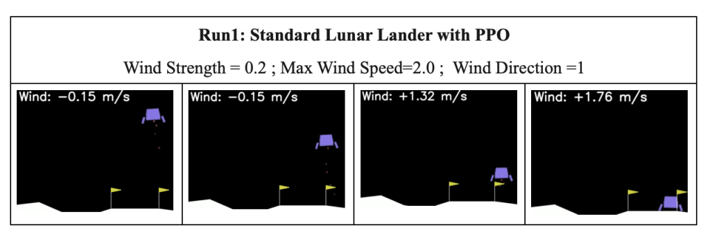 - Landing Failure Confirmation: With self.wind_direction = 1 (57.3° northeast), the lunar lander failed to achieve consistent precision landing between flags, contradicting previous theoretical predictions of direction independence and revealing a critical gap between training performance metrics (259.78 mean reward) and actual landing execution under specific diagonal wind conditions.