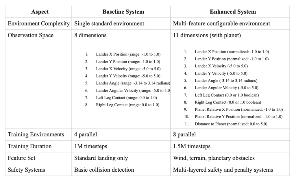 - Robust Safety Systems Preventing Catastrophic Policy Development: Environment-level safety mechanisms include severe collision penalties (-3000 reward) for planet contact or bypass violations, immediately terminating episodes to prevent catastrophic navigation behaviors. Conservative reward structures provide positive reinforcement (+5.0) for maintaining safe distances while implementing scaled danger penalties (up to -500) for unsafe approaches or incorrect landings. Bounded action spaces inherit continuous control limits from the base LunarLander-v3 environment, ensuring thrust vectoring remains within safe operational parameters (±1.0). Progressive reward scaling through terrain difficulty multipliers (1.5x for rocky/crater surfaces) and strategic penalty structures guide policy development toward reliable autonomous operation while preventing destructive behaviors through comprehensive safety constraints.