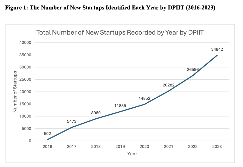 India has seen rapid growth in startup activity since the mid-2010s, driven by digital adoption, funding flows, and sectoral innovations (especially in technology and AI). The number of new startups in India in the year 2016, identified by the Department for Promotion of Industrial and Internal Trade (DPIIT), was 502, while in the year 2023 it was 34842 (Department for Promotion of Industry and Internal Trade [DPIIT], n.d.-b).