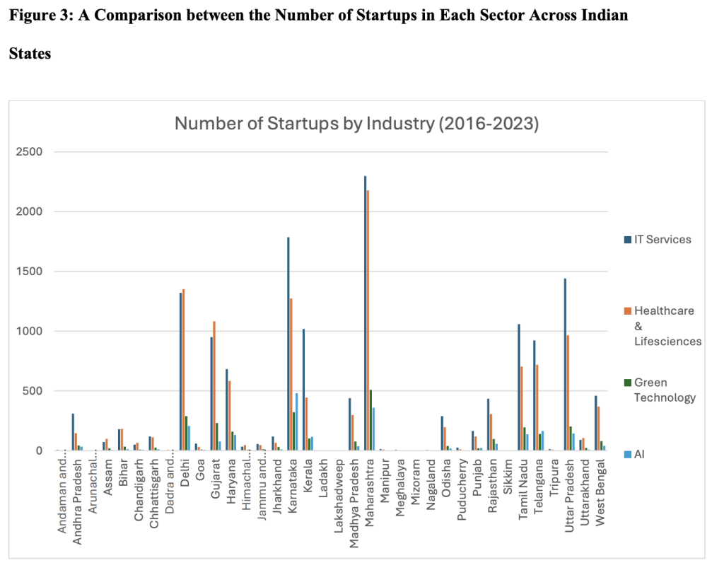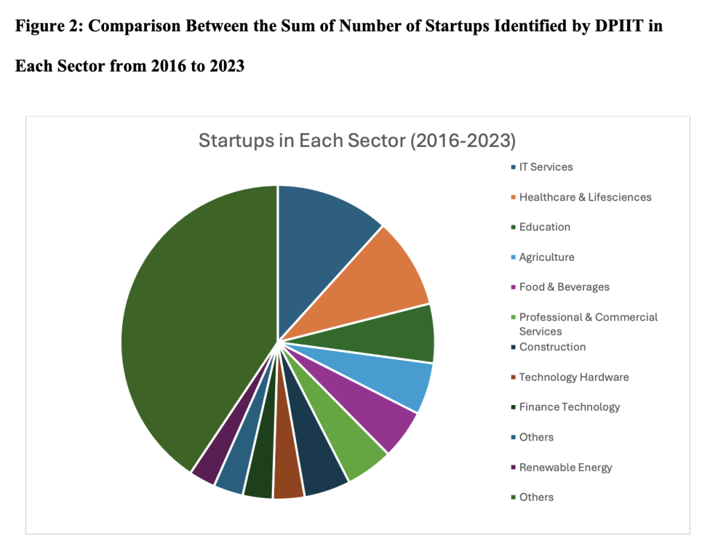 These startups were split into multiple sectors, with many of them being in emerging industries and well-established ones like IT Services, Healthcare & Lifesciences, Construction, Agriculture, Food & Beverages, and Education. Figure 2 shows a rough split between these industries in the year 2023.