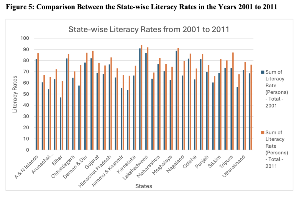 It is important to note that these values may differ from the actual literacy rates, and do not account for the changing policies or other external factors which may affect the literacy rate. For example, the Ministry of Statistics & Programme Implementation’s annual report for 2023 projects an overall literacy rate of 80.9%, suggesting a slightly lower growth during this time span. However, within the scope of this study, we can assume that the growth has remained consistent in the 10-year period of 2001-2011.