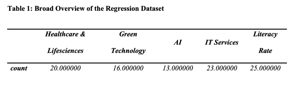 Comparing linear regression results of the number of startups in a region across four major sectors (AI, IT Services, Green Technology, Healthcare and Lifesciences) and the literacy rates, we did not find a strong association between the two, except in the IT Services sector.