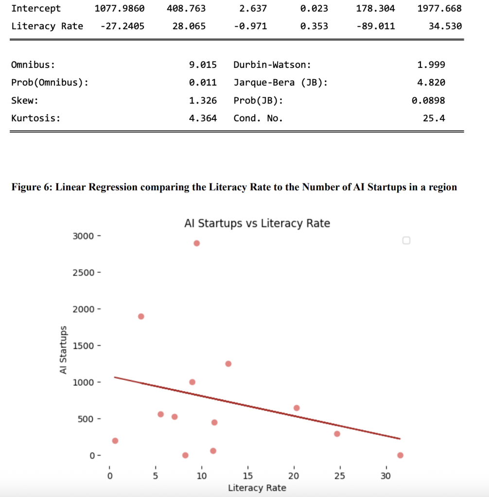 I have used the OLS (Ordinary Least Squares) regression for quantifying the linear effect of literacy on the number of AI startups in a region. From Table 1, we can see that we have considered a total of 13 states in this analysis. The p-value in this table is quite high (0.353), which makes this result statistically insignificant, i.e., there is no strong evidence of a linear association between the two variables.