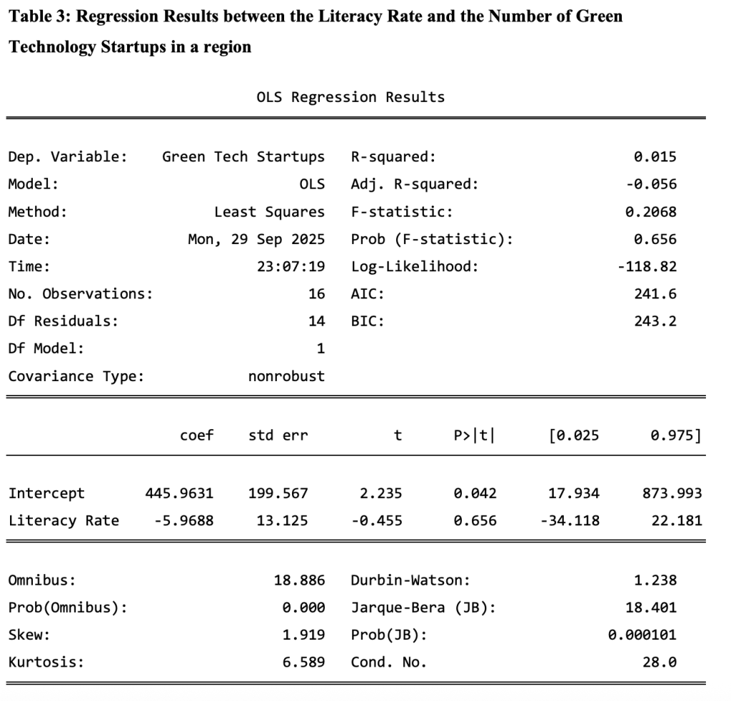 In Table 3 and Figure 7, we are trying to determine if a linear relationship exists between the Literacy Rate and the number of Green Technology Startups in a region. Here, I have considered 16 states for the regression. In this case too, the p value is extremely high (0.656), thus making the result statistically insignificant.