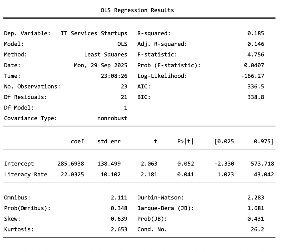In Table 4 and Figure 8, we are trying to determine if a linear relationship exists between the percentage change in literacy rate and the number of IT Services startups in a region. Here, I have considered 23 states for the analysis. In this case, the p-value is much lower than the previous cases (0.041), which suggests that this result may be statistically significant. The slope here is approximately 22.03, i.e., a 1%-point increase in the literacy rate is associated with ~ 22 new IT startups per year. Additionally, literacy accounts for ~ 19% of variance in annual new IT Services startup counts (R² = 0.185).