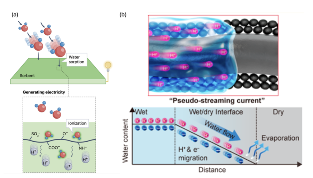 As the global demand for sustainable energy solutions grow, harvesting energy from ambient environments, such as heat, light, and humidity, has opened a vital research frontier. Among these, Moisture-Sorption-Based Energy Harvesting (MSEH) offers a unique advantage: continuous operation under low-resource conditions. Through MSEH, energy can be generated through just a solvent and moisture: when water vapor sticks to a sorbent, it forms bonds and releases heat; when water evaporates off a sorbent, it absorbs heat from surroundings, which produces a cooling effect. During this process, constantly adsorbed and desorbed, water molecules interact with hydrophilic groups on sorbents, leading to ion migration, which generates voltage and current. More specifically, water molecules in the atmosphere interact with the hydrophilic parts of the sorbent. This interaction causes ions to dissociate and move from the surface inward. This movement of charges creates voltage and current—thus generating electricity. Figure 1 illustrates this process, demonstrating how moisture uptake and evaporation drive charge movement within a hygroscopic material.