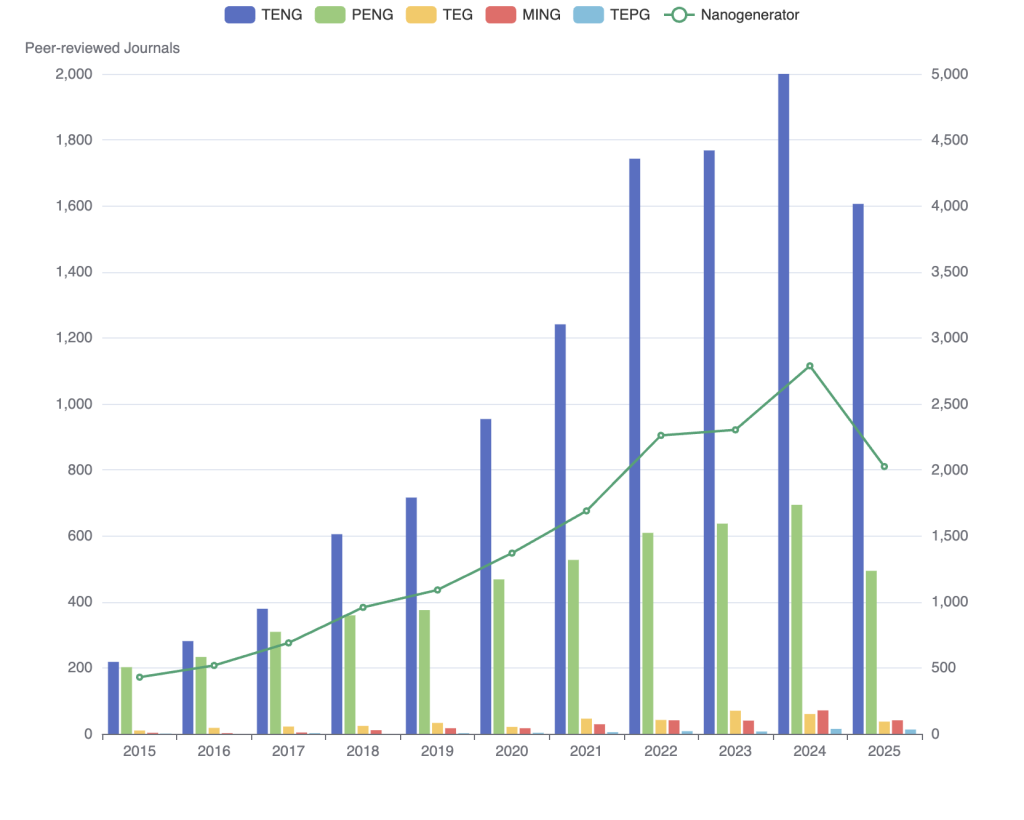 As shown in Figure 3, the number of peer-reviewed articles on nanogenerators has been rapidly increasing over the past decade, with an approximate increase of 549.65% between 2015 and 2024—a near sixfold increase in under a decade. This growth far exceeds increasing rates in broader “energy harvesting” publications, which also grew substantially—from 3,858, in 2015 to 9,226 in 2024. Most notable increases happened in mechanical energy subcategories, including the triboelectric nanogenerators, more than tenfolding from 218 in 2015 to 2,788 in 2024, and piezoelectric nanogeneratores, tripling from 202 in 2015 to 694 in 2024. The sharp increase in the number of publications not only indicate rapidly growing academic curiosity and attention on nanogenerators but also validates the technical feasibility of nanogenerators.