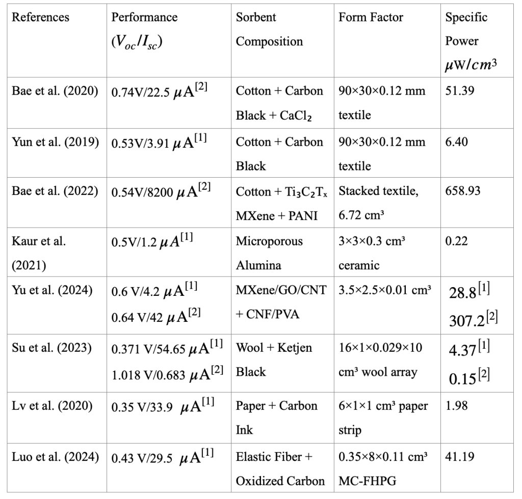 Table 2 demonstrates the 8 most highly-impacted publications on TEPG, including information on each research’s performance (open-circuit voltage & short-circuit current), sorbent composition, form factor, and specific power. The table reveals natural cellulose-based sorbent to be the predominant sorbent model in TEPG, often enhanced with advanced materials that exhibit high hygroscopicity. In fact, the most highly cited and best-performing articles—Bae et al. (2020), Yun et al. (2019), Bae et al. (2022)—all used cotton combined with another material as their sorbent, highlighting the potential of enhanced cotton in TEPG. Additionally, the exponent numbers in the performance section indicate whether the experiment was conducted in deionized water [1] or ionized water [2], for more accurate comparisons.