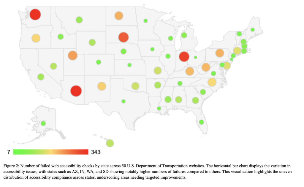 The results of this study highlight that digital accessibility must be treated as a core design priority rather than an afterthought. One of the most revealing findings was the percentage of accessibility checks passed across the 50 U.S. State Department of Transportation websites, which provided a general benchmark of compliance with WCAG 2.2 standards. While a handful of states achieved high compliance (above 90%), a significant portion scored well below that, often in the 60–70% range, placing them in the semi-compliant category, and a few even dipped below 50%, indicating a severe lack of attention to accessibility.