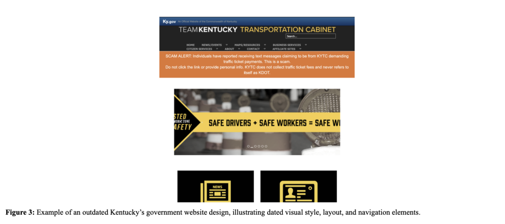 In parallel, the importance of website aesthetics and structure in shaping usability has been explored through design-focused studies of government web portals. Watkins and Wills, for instance, analyze the digital design of U.S. city government websites and describe a recurring “legacy design trap”, in which outdated layouts, unresponsive interfaces, and poor information hierarchy diminish the user experience, particularly for underrepresented and aging populations (Wagner et al., 2024). In the transportation sector, Graham Currie and Mandy Gook conduct usability testing on a sample of transportation agency websites, identifying serious issues in visual consistency, navigation, and user trust. Their work supports the idea that design shortcomings are not purely aesthetic but functionally consequential in reducing civic engagement (Currie & Gook, 2009). Similarly, Patricia Acosta-Vargas applied automated tools to evaluate a set of business websites for accessibility metrics, providing a technical foundation for large-scale digital evaluations (Acosta-Vargas et al., 2017). Unlike these studies, which focus on localized or small-scale usability assessments, my analysis interrogates accessibility as both a design and equity issue, examining how aesthetic and structural flaws intersect with legal compliance gaps. This approach moves beyond surface-level usability to reveal how design decisions can perpetuate systemic exclusion within essential public infrastructure.