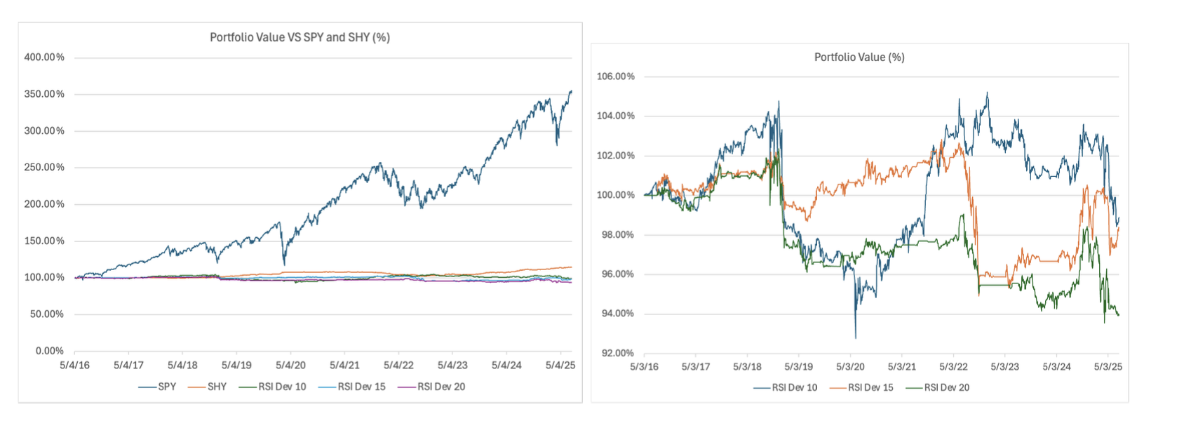 The RSI and MA strategy tested in this paper underperformed across all annualized metrics in the ten-year testing period, but its implications suggest a broader role of technical analysis in risk exposure. All three strategy variants show negative risk-adjusted values when compared to SHY and display negative Sharpe, Calmar, and Sortino ratios. These outcomes are consistent with the weak form of the Efficient Market Hypothesis, which holds that past price data contains no predictive or actionable information. However, this underperformance does not imply that the signals were entirely random or meaningless. The return paths of DEV 10, 15, and 20 were similar for most of the ten years. Positive covariance in the three strategy variations suggests exposure to similar structural patterns in the market. The strategy may not unconditionally generate alpha, but it might expose investors to certain risks hidden in asset prices.