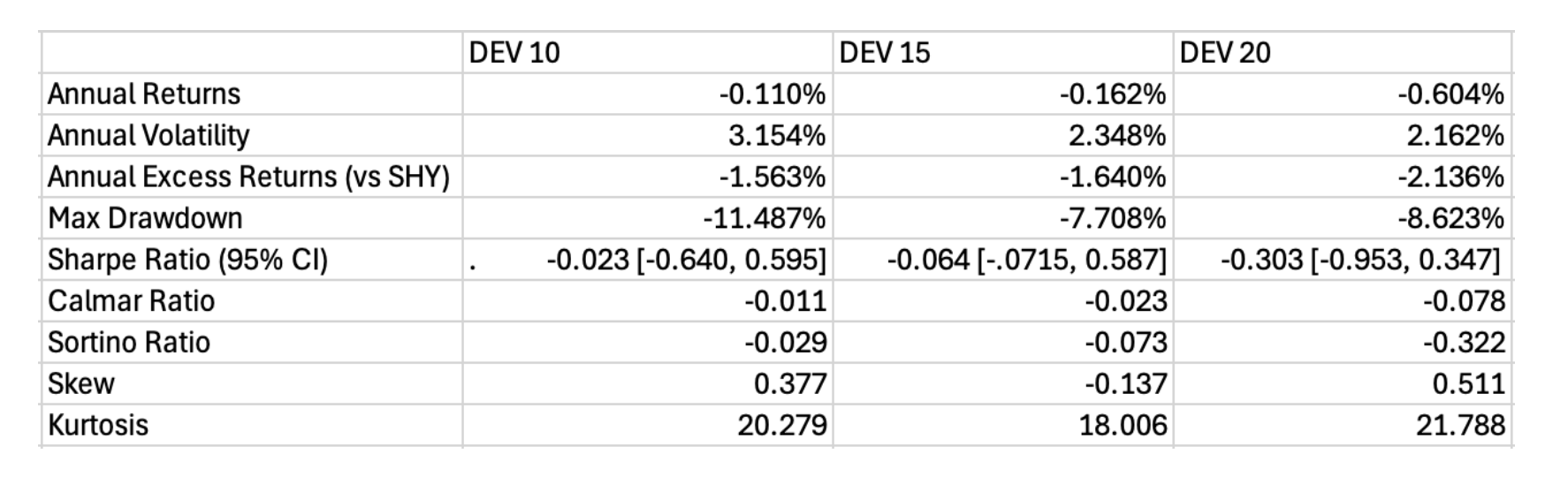 Annual returns were negative across all three configurations. Annual excess returns versus SHY and SPY were also negative, the lowest being DEV 20 (-2.129%) and the highest being DEV 10 (-1.514%). V olatility followed the same pattern, from 2.162% (DEV 20) to 3.154% (DEV 10). The Sharpe ratio also decreased with higher deviation thresholds, ranging from -0.480 (DEV 10) to -0.985 (DEV 20). However, 95% Newey-West adjusted confidence intervals for the Sharpe ratios include 0 in all three strategies, implying that the Sharpe ratios are statistically insignificant. Small, negative Sortino and Calmar ratios suggest poor performance compared to risk-free assets and drawdown, indicating greater downside risk.