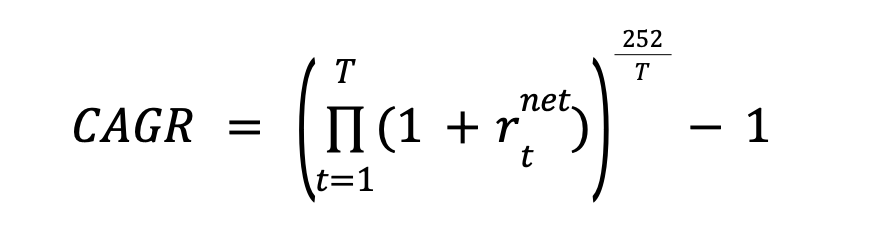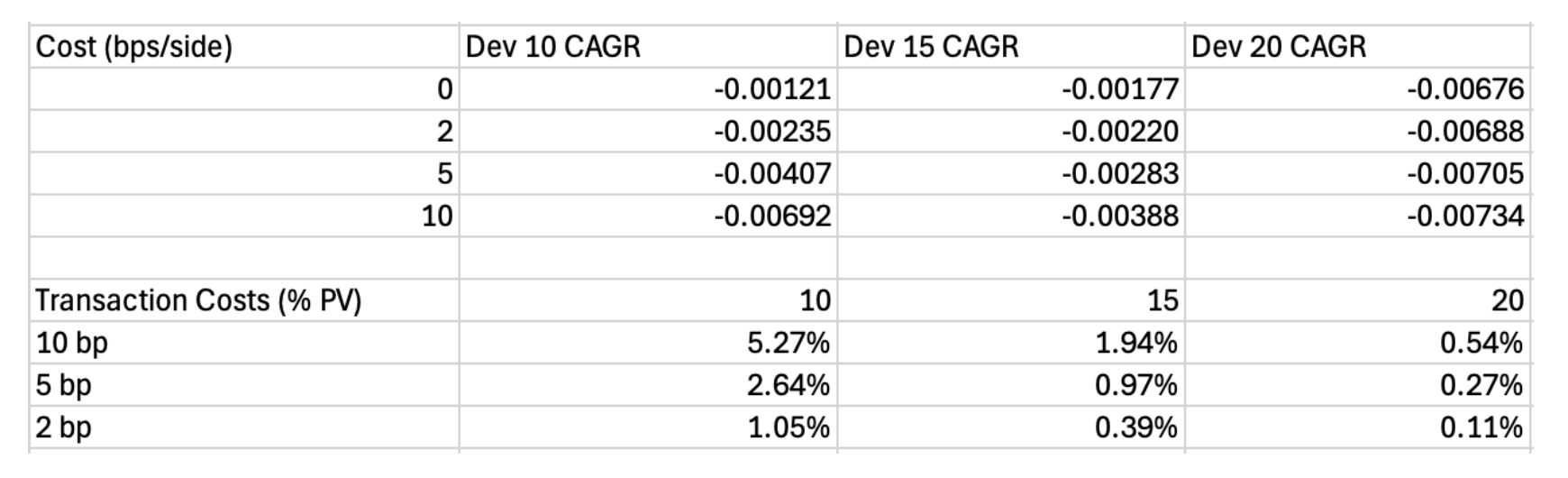 We then calculated the Compound Annual Growth Rate (CAGR) from the net return series, with results reported for costs of 0, 2, 5, and 10 basis points per side.