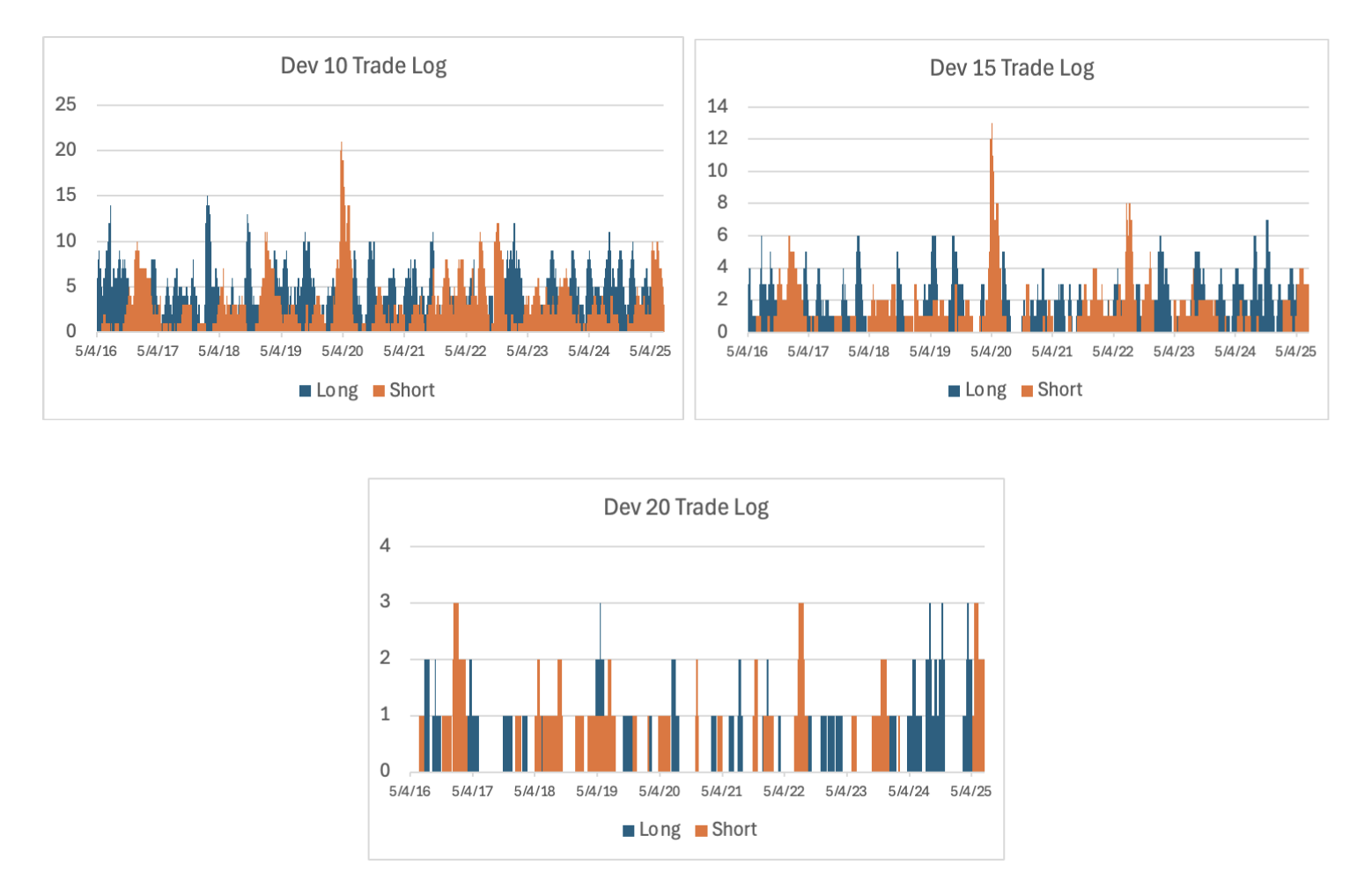 The above graphs show trade logs for each strategy, blue representing long trades and orange representing short trades. This log contextualizes higher transaction costs for the lower threshold strategy, Dev 10, which had the highest trade volume.