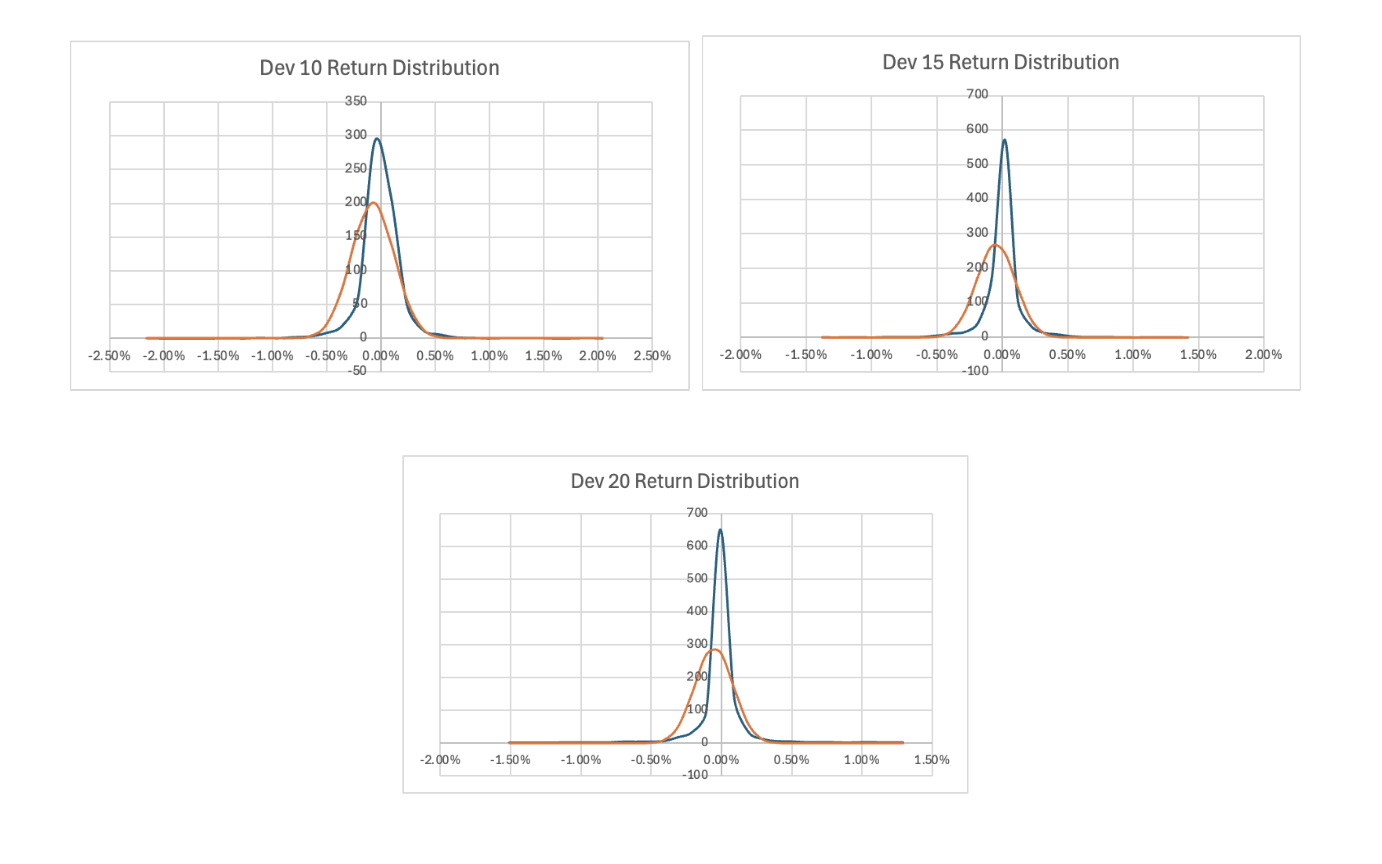 Returns for all three strategies were density-adjusted and compared to normal distributions. Return distribution plots for each test show a sharper central peak and heavier tails than Gaussian (high excess kurtosis). All three strategies display high kurtosis with values ranging from 18.006 (DEV 15) to 21.788 (DEV 20). Although most returns are clustered around the mean, this shows that these strategies experienced a significantly higher frequency of extreme return days than a normal distribution.