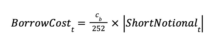 Where ShortNotionalt is the dollar value of the short position on day t . Borrow costs t are deducted from portfolio equity each day the short position remains open. Dividend payments owed on short positions are already incorporated in the adjusted price series used for return calculations, so no separate adjustment is required.