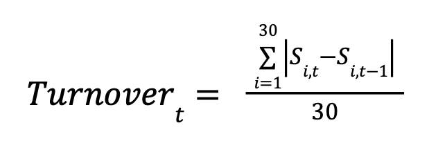 Transaction costs were incorporated by first calculating daily portfolio turnover as the average absolute position change across the 30 DJIA stocks.