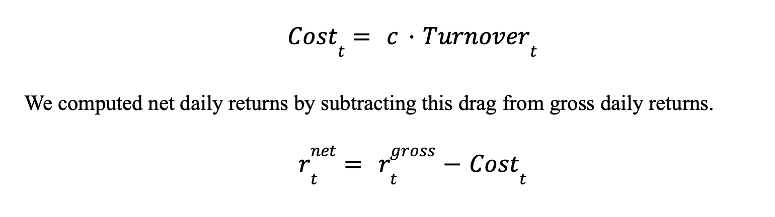 We multiplied this turnover by a per-dollar transaction cost rate c to estimate daily cost drag.