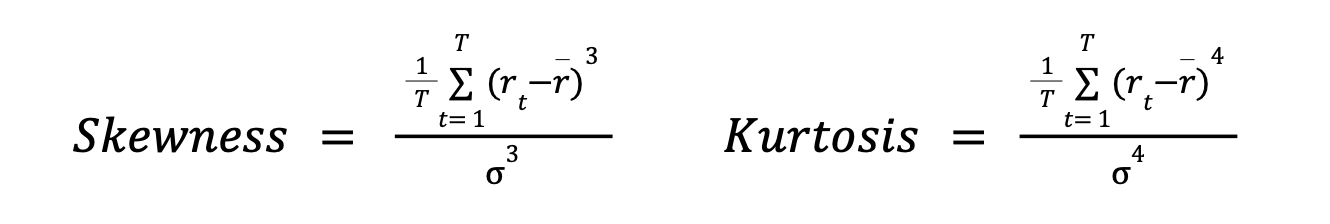 A growing body of research suggests that co-skewness and co-kurtosis are crucial in asset pricing. Skewness captures asymmetry in the return distributions of a portfolio. Positive skewness represents large gains with frequent small losses, while negative skewness represents frequent small gains with the potential for large losses. Kurtosis measures the tailedness of the 0 return distribution, where high kurtosis represents a higher probability of extreme values, while low kurtosis represents a lower probability of extreme values.