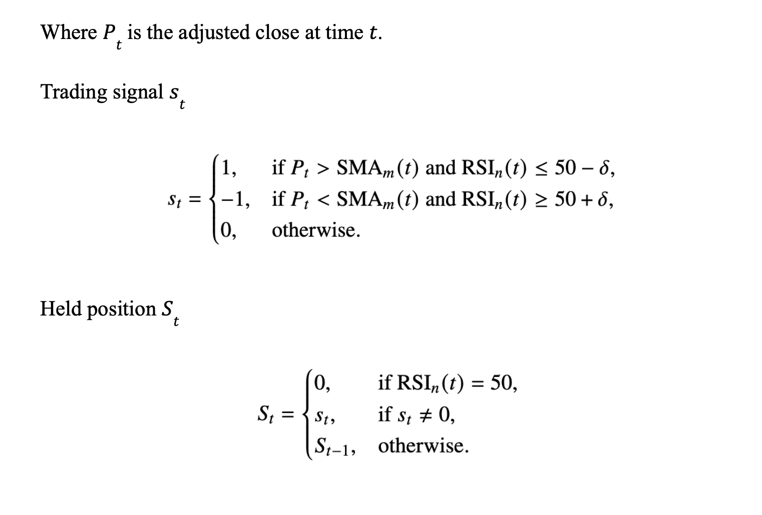 The RSI is computed on adjusted closes using Wilder’s smoothing as: