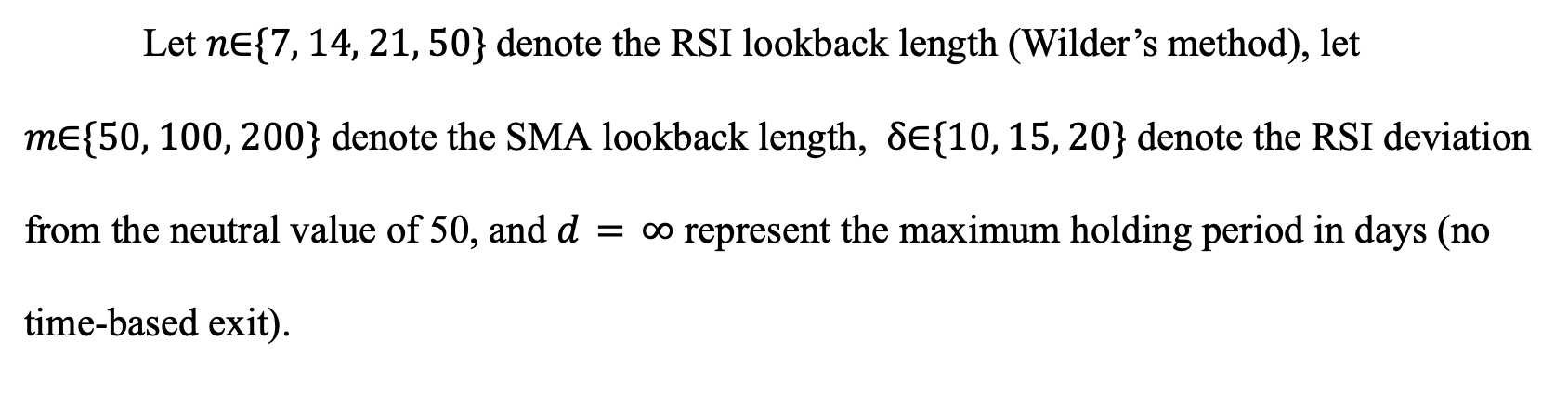 To adapt the strategy to evolving market conditions, we partitioned the 10-year sample into 40 quarterly segments. For each RSI deviation threshold (10, 15, and 20), an initial quarter runs with default parameters of RSI(50) and SMA(200). At the end of each quarter, we evaluate RSI and SMA combinations based on their Sharpe ratios. We apply the combination with the highest Sharpe ratio to the next quarter. This process repeats in a walk-forward fashion across all 40 quarters, producing a series of returns in which each quarter’s parameters reflect the most profitable configuration from the preceding quarter.