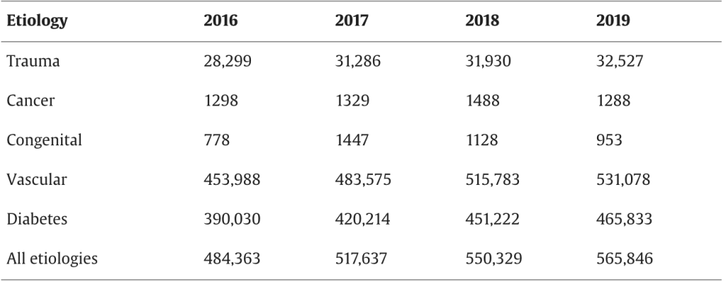 Table 1: Number of amputation procedures in the US from 2016-2019. Note that diabetes is nested within vascular diseases, so the diabetes row should not be included in the sum (Rivera et al., 2024).
